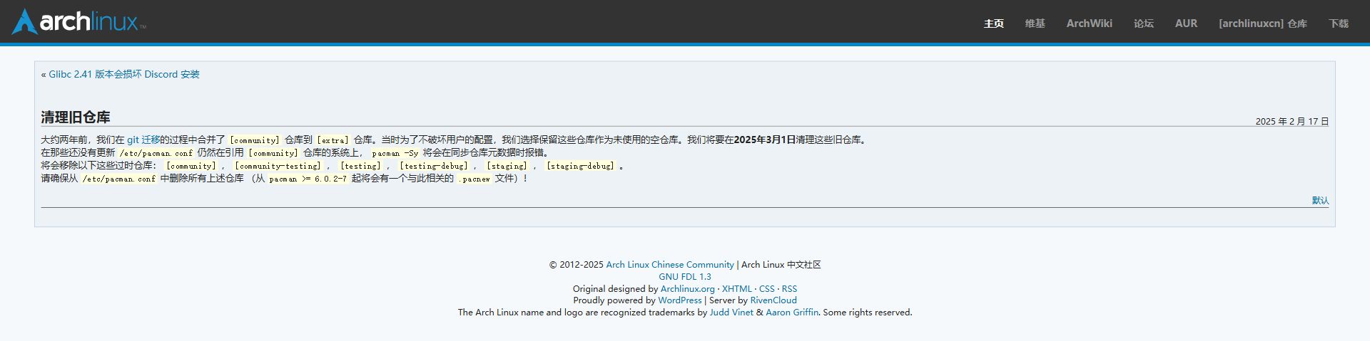 原因是Arch官方在2025年3月1日起废除了部分仓库内容