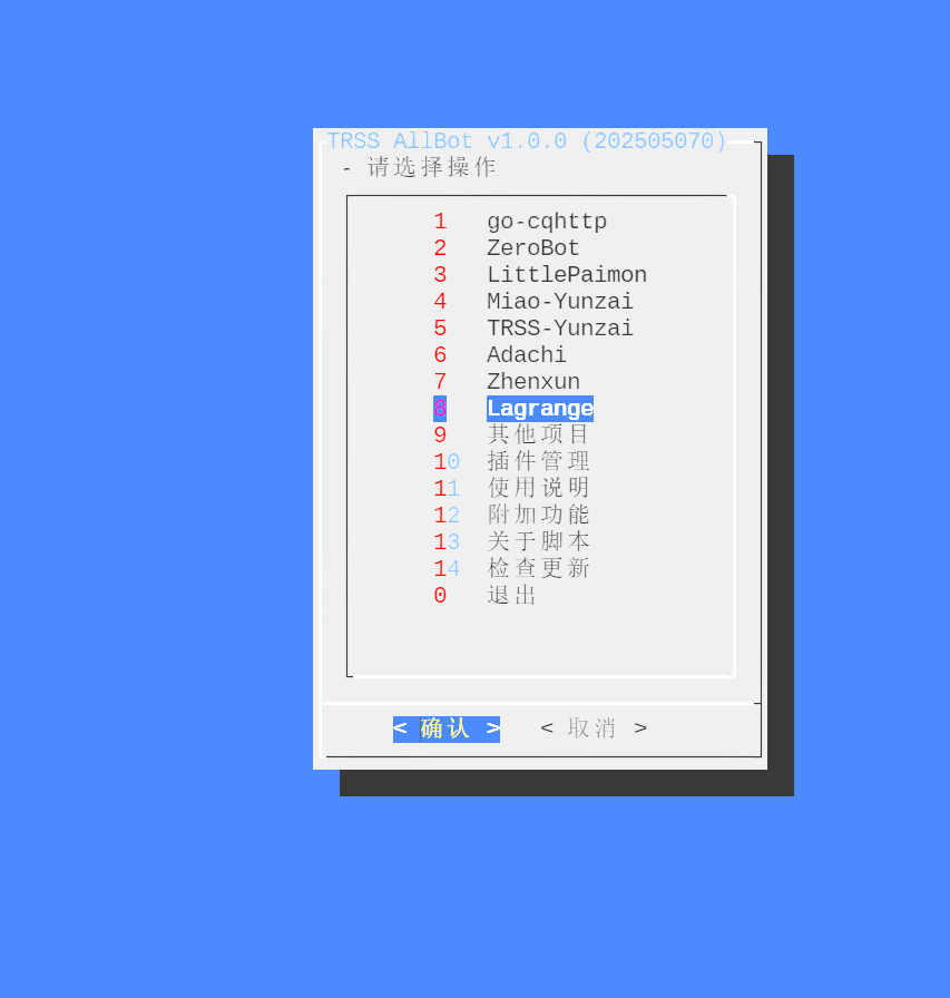 如果拉格朗经常掉线,无响应,可能签名问题,可以访问/root/TRSS_AllBot/Lagrange/机器人账号/appsettings.json配置代理